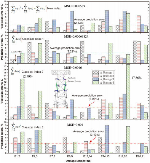 Selected results for Area A are presented in Figure 7. As indicated, the prediction errors are generally minimum using the combination indices proposed, with the maximum prediction error of 7% and the average error of 2.83%. When the damage indices are just measurement points in the x-direction (), the damage identification accuracy reduces and the maximum identification error is close to 9% among the test samples and the average prediction error is close to 3.2%. When the damage indices are just measurement points in the y-direction (), the damage identification accuracy has an MSE of 0.0016 and a maximal relative error of more than 17% among the test samples. When the damage indices are just measurement points in the z-direction (), the damage identification has an MSE of 0.001 and a maximum relative error of more than 9% among the test samples. Thus, it is a good choice to use the sum of the first modal results in the x-, y-, and z-directions at each measurement point as one single damage index during the damage identification process.