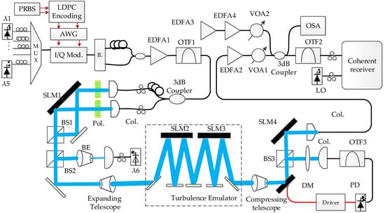 Optical communication systems are usually deployed over fiber-optic links [1,2,3], free-space optical (FSO) links [4,5,6], or hybrid FSO-fiber links [7]. Recent advances in photonics integrated circuits (PIC) have been greatly pushing forward the worldwide application of optical communications [8,9,10]. Although they have enabled a capacity-approaching communication [11,12,13], fiber-optic links may be too fragile or costly to be deployed in some environments, e.g., seismic belts. As a result, FSO links are more favorable due to their easy and fast communication link reconstruction. Although the channel loss of FSO links is not stable, and typically higher than that of fiber-optic links, FSO communication systems provide free-scalable channels for spatial mode division (SDM) multiplexing, e.g., orbital angular momentum (OAM) multiplexing [14,15,16,17]. Despite their free-scalable characteristics, spatially multiplexed modes hardly preserve their orthogonality when transmitting over the atmospheric FSO links, resulting in dynamic inter-mode crosstalk [18,19,20].