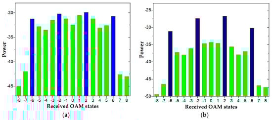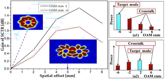 The signal-to-crosstalk ratio (SCTR) gains achieved by SO are presented in Figure 5. The SCTR is measured after the OAM mode detection. It is defined as the power ratio of the desirable OAM mode and neighboring OAM modes, in the scenario where the desired OAM mode is generated exclusively at the transmitter. The insets in Figure 5(a1,a2) show the measured SCTR gains. The SCTR improvement of >1.6 dB is achieved for OAM state 2; and the SCTR gain of >1 dB is available for OAM state −6. The data shows that the best SO is at 6 mm and 5 mm for OAM states 2, and −6, respectively. For simplicity, the SO will be set to 5 mm for all following cases in this paper.