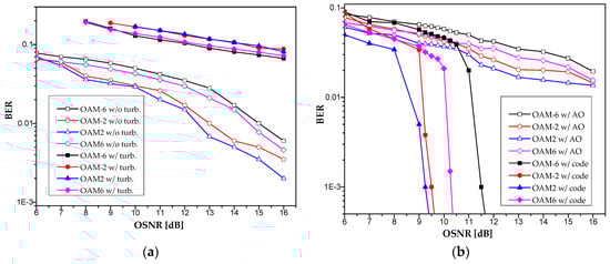 BER vs. OSNR performance in the atmospheric turbulence-free environment, when (a) OAM state 2 is under testing; (b) OAM state −6 is under testing.