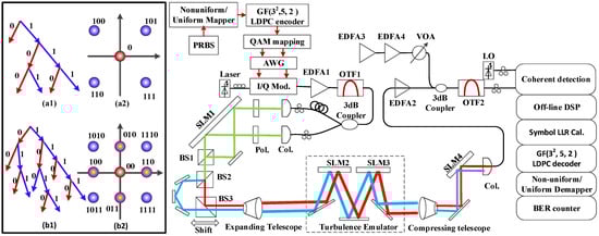 Figure 4 shows the experimental setup for joint Huffman and LDPC coding enabled FSO communication system. In the transmitter, a 1550 nm CW light is generated as the optical carrier, and passes to an optical I/Q modulator. The PRBS signals are coded by Huffman procedure to the symbol sequences with alphabet sizes of 5 and 9 respectively [30]; or uniformly mapped to symbol sequences with alphabet sizes of 4 and 8, respectively. Then the GF(5), GF(32) based nonbinary LDPC encoding is used, followed by mapping procedures from the coded sequences to 5-QAM and 9-QAM signals, respectively. Classical binary LDPC encoding is implemented for QPSK (or 4-QAM) and 8-QAM sequences. The used Huffman trees and the 5/9-QAM formats with corresponding bit labeling are provided (Figure 4(a1,a2,b1,b2)). When 12.5 G Baud electronic signals are generated, they drive the I/Q modulator. The optical signals are boosted by EDFA1, and filtered with an OTF. Then optical signals are separated by an optical coupler, decorrelated, and converted to OAM states 2 and −6 by SLM1. The formed OAM modes are combined and centrally aligned by BS1. BS2 is used to separate the multiplexed OAM modes, and re-combined by the BS3. The optical signals in one optical path bounce off a mirror one time to generate the opposite OAM modes, i.e., OAM states −2 and 6. The optical signals in the other path bounce off four times to keep the original mode states and decorrelate the carried optical signals. The desired SO between the two optical paths can be achieved by adjusting the BS3 position. In this setup, the limited SLM screen size restricts the SO freedom. To reduce the side effect-induced inter-mode crosstalk and mode power loss, OAM states 2 and −6 are centrally aligned and transmitted in one optical path, while OAM states −2 and 6 are combined and launched onto another optical path.