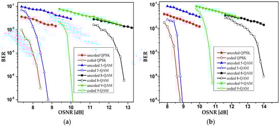 In Figure 6, we analyze the effects of the nonuniform signaling. The data represents BER performance in the atmospheric turbulence-free environment. Figure 6a,b shows that the pre-FEC performance of 5-QAM is worse than that of the QPSK due to the implementation and DSP penalties. These data also indicate that the pre-FEC performance of 9-QAM can outperform the 8-QAM. However, the post-FEC OSNR penalties between the 5-QAM and QPSK are measured to be <0.3 dB and 0.2 dB, in the respective OAM states 2 and −6, when the BER is 10−4. In addition, GF(32) LDPC encoded 9-QAM shows a better performance over GF(2) LDPC coded 8-QAM by 2.7 dB and 3.2 dB in respective OAM states 2 and −6, when BER is 10−4.