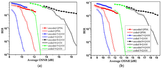 The BER performance affected by atmospheric turbulence is shown in Figure 7. The data indicate that the pre-FEC BER performance gap between QPSK and 5-QAM shrinks in an atmospheric turbulence limited environment; while the pre-FEC BER performance of 9-QAM is better than that that of the 8-QAM. Figure 7a shows that, if OAM state 2 is under testing, the average OSNR gains of >1.6 dB and 5.6 dB are reached by 5-QAM and 9-QAM, respectively, when the post-FEC BER is 10−4, compare to coded QPSK and 8-QAM. In addition, if OAM state −6 is detected, as depicted in Figure 7b, the coding gains of >1.1 dB and 5.4 dB can be obtained when the post-FEC BER is 10−4 respectively by comparing 5-QAM with QPSK, and 9-QAM with 8-QAM. It is noteworthy that we only measure the performances of OAM states 2 and −6, this is due to the symmetry between OAM modes with positive and negative states. In other words, OAM state 2 will have a very similar performance as OAM state −2; while OAM state 6 will also have a similar performance as OAM state −6.