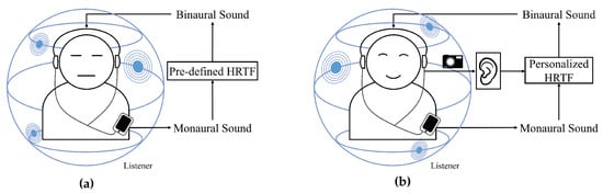 To date, audio rendering, which is a spatial audio processing technique, has been used to localize a sound source to an arbitrary position in 3D space. Thus, a listener perceives a sound produced from a localized position virtually. The audio rendering can be conducted in either the binaural or transaural configuration []. In a binaural configuration through headphones, research on spatial sound has focused primarily on finding the relationship between the position of a given sound source and the listener’s ears. The relationship between such a sound source and the listener is typically called the head-related transfer function (HRTF), through which spatial sound is produced. The HRTF can be measured using a dummy head that mimics the human eardrum []. This measurement represents the effects of the head, body, and pinna and the pathway from a given source position to a dummy head. Therefore, HRTFs differ from person to person because sound propagation varies due to the head, torso, and eardrums of each person []. Applying measured HRTFs from a dummy head or other people to a specific person can degrade the performance of immersive sound effects due to the variance in personal characteristics. Therefore, HRTFs should be individually designed or measured to obtain localization performance. Figure 1 shows a possible application of the personalized HRTF when playing sound in a binaural configuration. As shown in Figure 1a, a traditional approach to generating binaural sound from monaural sound is using a pre-defined HRTF, but the proposed method shown in Figure 1b enables us to provide better sound quality to a listener with HRTF that is personalized to the listener.