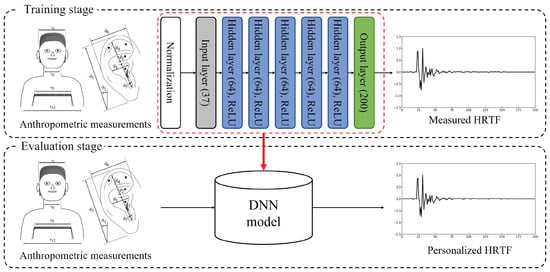 To compare the performance of our proposed method in Section 3 with the neural network model described in this section, a DNN is constructed as shown at the upper block of Figure 2. The DNN model here is composed of one input layer, five hidden layers, and one output layer. There are 37 input units (17 parameters for the height and circumference measurements and 20 for the pinna measurements for both ears), as described in Table 1, and the number of output nodes is set to 200, corresponding to the length of the HRTFs. In addition, the number of each hidden layer’s nodes is set to 64 and the rectified linear unit (ReLU) is applied as an activation function for each layer because the ReLU activation function is known to be effective for solving gradient-vanishing problems []. Moreover, since the range of anthropometric measurement is different between measurements, a measurement with a small range may not influence learning. Thus, each input feature for the DNN is normalized using the mean and variance for all training data without regard for the subjects, such as