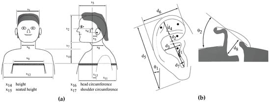 Variables of anthropometric measurements: (a) head and torso measurements and (b) pinna measurements [].