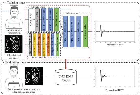Figure 4 illustrates a block diagram of the proposed HRTF personalized method, including the architecture of a DNN for the proposed personalized HRTF estimation, where both anthropometric measurements and ear images are used as input features, and HRTFs are used as target features. As shown in the figure, the proposed neural network is composed of three sub-networks. The first sub-network of the proposed neural network is a DNN that uses anthropometric measurements as input features to represent the information on the relationship between anthropometric measurements and HRTFs, which is referred to as “Sub-network A”. The second sub-network is a feature representation network based on CNN from ear images and referred to as “Sub-network B”. The two sub-networks are combined together using another DNN to estimate personalized HRTFs, referred to as “Sub-network C”.