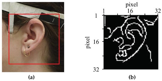 Figure 5 illustrates an example of an original color image from the CIPIC database as well as the edge-detected ear image. The image size of the edge-detected ear image, as shown in Figure 5b, is 32 × 32 pixels, where the ear image corresponds to the boxed area of Figure 5a. The Canny edge detection algorithm [] is used here, which is as follows: