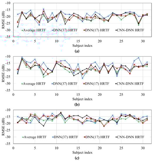 Figure 6 compares the RMSEs of the individual subject according to different HRTF estimation methods, measured at −135°, −80°, and −45°. Note that the performances of the HRTFs at 135°, 80°, and 45° were identical to those at −135°, −80°, and −45°, respectively. In addition, Table 2 compares the average HRTF over all the HRTFs in the CIPIC database, measured at −135°, −80°, and −45°. As shown in Figure 6 and Table 2, the DNN-based method (DNN(37) HRTF) and the proposed method provided RMSEs that were 1.91 and 0.88 dB higher than the average HRTF method, respectively. Even though the average HRTF had the lowest RMSE because this was obtained from exact pinna measurements, it was actually hard to get pinna measurement data from live human ears. Without such pinna measurements, the DNN-based method increased RMSE by 0.02 dB. Thus, the RMSE of the estimated HRTF by the proposed method was lowered than that estimated by the DNN(17) HRTF.