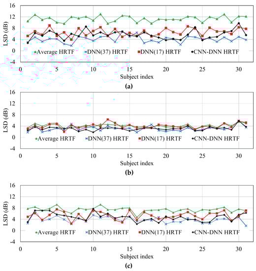 All methods were implemented in MATLAB with a version of R2013b using Tensorflow whose version was r1.1.0 with Python 3.5.2. In this paper, 30 subjects and one subject of the CIPIC database were used for training and testing each neural network, respectively. Then, 31 cross-validations were performed and measurements were averaged over all cross-validations. Note here that the average HRTF method took an average over the HRTFs of all 31 subjects. In addition, since there were 1250 different environments (25 azimuths and 50 elevations), both the proposed method and the DNN-based methods were constructed in each different environment, resulting in 1250 CNN–DNN HRTFs, 1250 DNN(37) HRTFs, and 1250 DNN(17) HRTFs.