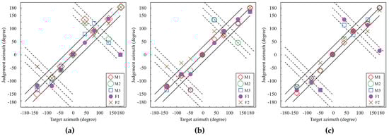 Results of the localization test according to the different HRTF estimation methods: (a) average HRTF, (b) 17 head and torso measurements for HRTF (DNN(17) HRTF), and (c) CNN–DNN HRTF (proposed method).