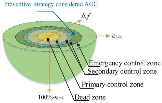 To minimize emergency situations for a power system when a large load suddenly occurs, a preventive strategy for AGC is described below. Frequency deviation ranges from to and from to were selected as the ranges for the preventive strategy. The preventive strategy aims to maintain the system frequency deviation at a minimum value, i.e., and . The frequency deviation for the preventive strategy was set to 0.2 Hz in this study.