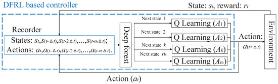 The DFRL-based controller contains a recorder for diachronic states and actions, deep forest, and Q learning frameworks (Figure 4). To reduce the memory of calculation, the Q-value matrix and the probability distribution matrix of Q learning are split into a total of Q-value matrices and probability distribution matrices, respectively. Thus, the calculation memory for matrix and matrix can be reduced by ,