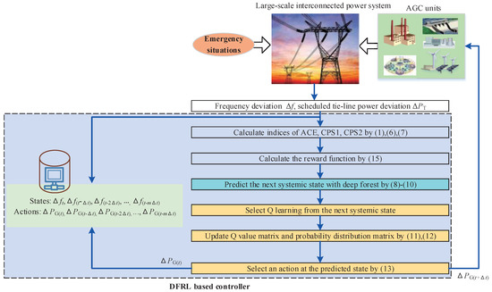 Over the past few decades, there has been a growing trend of connecting new and renewable resources to large-scale interconnected power systems [1,2]. Automatic generation control (AGC) aims to balance the active power between generators and system loads in such large-scale interconnected power systems [3]. Recently, numerous control algorithms have been proposed for the AGC of large-scale interconnected power systems. For example: an optimized sliding mode controller (SMC) [4] was proposed for the AGC of interconnected multi-area power systems in deregulated environments [5]; a two-layer active disturbance rejection controller (ADRC) was designed for the load frequency control (LFC) of interconnected power systems [6]; a fractional-order proportional–integral–derivative (FOPID) controller with two or three degrees of freedom was employed for AGC [7,8]; and optimized fuzzy logic control (FLC) was utilized for LFC in hydrothermal systems [9]. A modified cuckoo search algorithm [10] and an efficient and new modified differential evolution algorithm [11] were also proposed for hydrothermal power systems. Furthermore, many reinforcement learning algorithms which can update their control strategies online have been utilized for AGC: a relaxed Q learning-based controller was proposed for relaxed AGC [12,13]; a Q() learning-based controller was applied to smart generation control in multi-agent systems (MASs) [14]; and an R() imitation learning-based controller was designed for AGC [15]. These reinforcement learning algorithms can achieve high control performances with small system loads [12], and the convergence of reinforcement learning was proved by Christopher John Cornish Hellaby Watkins [16]. However, these reinforcement learning algorithms have two major weaknesses, including that (i) they may not balance active power between generators and large system loads, and (ii) they may lead to a systemic frequency deviation that is larger than the frequency deviation limitation (0.2 Hz) [17]. Moreover, a low-level reserve capacity in an electric power system leads to emergency situations during generation control in large-scale interconnected power systems [18,19,20,21]. For example, an frequency emergency control strategy was considered for high-capacity generators and a low-load grid [19]; the emergency conditions were applied to the LFC of power systems [20]; and regional frequency-based emergency control plans were addressed in [21]. Therefore, a preventive strategy for an AGC controller with the aim to prevent emergency situations should be considered.