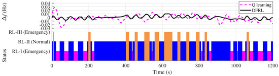 The total states of these reinforcement learning algorithms (i.e., RL-I, RL-II, and RL-III) of DFRL cover from to ∞ (Table 1). These state range of these reinforcement learning algorithms are divided for AGC, which is a special discrete control system (Table 1). The optimal control for an ideal discrete control system based on AGC is one in which . The number of actions in the action set of each subsidiary reinforcement learning algorithm of DFRL was set to 11 (Table 1), which is according to [3]; thus, the total number of actions in these three subsidiary reinforcement learning algorithms of DFRL was 33, or 11 × 3; meanwhile, the number of actions in the action set of conventional reinforcement learning was set to 33.