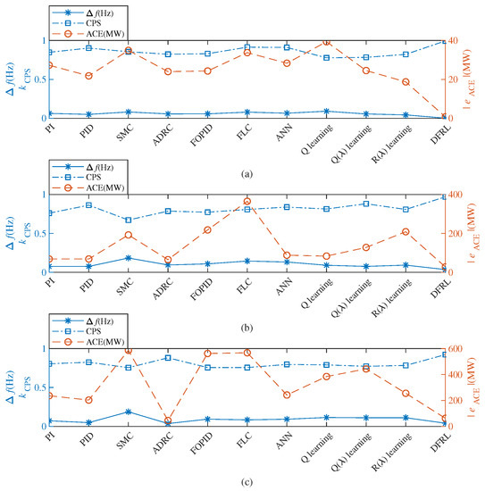 The statistic simulation result obtained by the DFRL and conventional AGC algorithms is shown in Table 2 and Figure 11. Note that, in Table 2 and Figure 11, the frequency deviation and ACE are the average absolute values of all areas in all cases in the two-area power system, three-area power system, and four-area power system, respectively. Statistic simulation results (Table 2 and Figure 11) obtained by the DFRL and conventional AGC algorithms show that:
