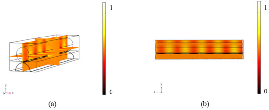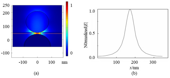 The normalized electric field distribution of the two-dimensional and three-dimensional models of the laser was simulated by the finite element method. The simulation results are shown in Figure 2 and Figure 3. It can be seen from Figure 2a that the field enhancement effect at the air groove between the nanowire and the graphene is remarkable, and the high localization of the energy constraint is achieved. This is because the continuous movement of electrons on the surface of the metal film causes a strong light field to be generated there, and at the air gap between the metal Ag and the nanowire, the semiconductor nanowire waveguide mode is coupled with the surface plasmon mode of the metal interface, resulting in a localized effect of partial energy. Figure 2b is a normalized electric field distribution of the horizontal serif in Figure 2a. It can be seen from Figure 3 that under the excitation of the pump light, which is lased by a titanium sapphire laser with a center wavelength of 405 nm, a repetition rate of 10 kHz, and a pulse width of 100 fs [41], the SP wave generated on the metal surface is coupled into the CdS nanowire through the graphene and the air gap. The CdS nanowire is used as the gain medium and also the FP resonator, so the partial SP waveguide and the high gain dielectric waveguide are coupled and oscillated from both ends of the nanowire after oscillation amplification in the cavity.