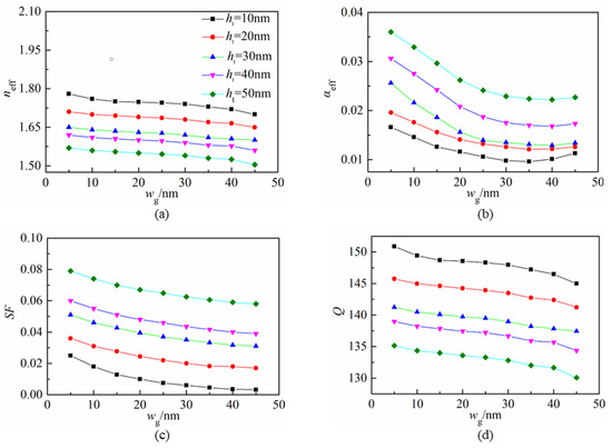 The mode properties change with the air gap, wg, and the distance, ht; (a) effective index, neff; (b) effective propagation loss, αeff; (c) normalized mode area, SF; (d) confinement factor, Γ.
