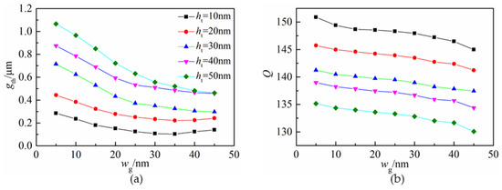 As can be seen from Figure 5a, the gain threshold, gth, decreases first and then increases with the expansion of the air gap width. gth gradually increases with the increase of ht when wg is constant. At wg = 35 nm, ht = At 5 nm, a minimum value of 0.14 μm−1 is obtained because the escalation in the depth of the air gap increases the loss of plasmon on the metal surface, which requires more optical gain, so the threshold is increased.