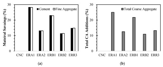 Material quantity change: (a) savings in cement and fine aggregate and (b) additions in total coarse aggregate.