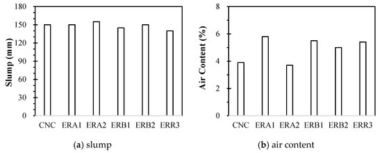Figure 4 shows the test results of concrete properties at the fresh state such as slump, air content. The mixtures slumps ranged between 140–155 mm and are depicted in Figure 4a. It was explained by Fathifazl [5] that, primarily because of higher water content, concrete mix with NCA resulted in bigger slump, comparing to the EMV mixture, and this usually results in slump loss. In this study, however, the slump loss was adjusted by the superplasticizer.