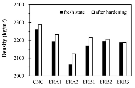 Figure 5 shows the density variation of each mixture at the fresh state and hardened states, compared to the CNC mixture. Figure 5 shows that as concrete hardened, its density showed little gain. Figure 5 indicates that the relative densities at the hardened state of the EMV mixtures (excluding 92.8% of ERA2) ranged from 95.6–97.6, compared to the CNC mix. The density of the ERA2 mix dropped about 3% more in both the fresh and hardened states. It is suspected that specimens of the ERA2 were inappropriately made.