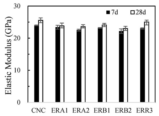 Figure 7 shows the average Young’s modulus of concrete samples at 7 days and 28 days with the traditional mixture and the modified EMV mixtures.
