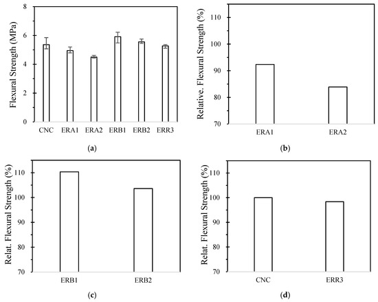 Flexural strength results of concrete samples (a) strength, (b) relative value of ERA series, (c) relative value of ERB series, and (d) relative value of ERR mix.