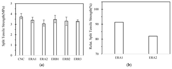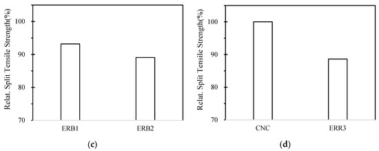 Figure 9a shows the average split tensile strength of concrete samples at 28 days. In addition, the relative strength ratios of the ERA series, ERB series, and ERR mix are shown in Figure 9b–d, respectively, compared to the split tensile strength of the control specimens (CNC). In contrast with the relation of the MOR to compressive strength, the split tension to compressive strength lineally follows the compressive strength trend. In Price’s study [47], the split tension of concrete to compressive strength was suggested to be 8.5% with a compressive strength of 4000 psi (27.6 MPa) and 7.7% with 6000 psi (41.4 MPa). Test results in Table 4 shows that the split tension to compression ranges from 9.6–10.7%, except for the ERR3 with a value of 8.4%. Overall, except for the ERR3 mix, a slightly higher split tensile strength values than expected were obtained.