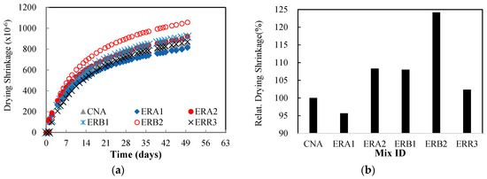 Test results of drying shrinkage are shown in Figure 10a, and their relative drying shrinkage to that of the reference specimen CNC is shown in Figure 10. Finally, at 50 days, the shrinkage strain of the control specimen CNC was 851 μ m/m. Compared to that of the control mix, the drying shrinkage values of the ERA1, ERA2, ERB1, ERB2, and ERR mix were 814 μ m/m, 922 μ mm/mm, 919 μ mm/mm, 1057 μ mm/mm, and 871 μ mm/mm, respectively, indicating roughly a 4% decrease, 8% increase, 8% increase, 24% increase, and 2% increase.