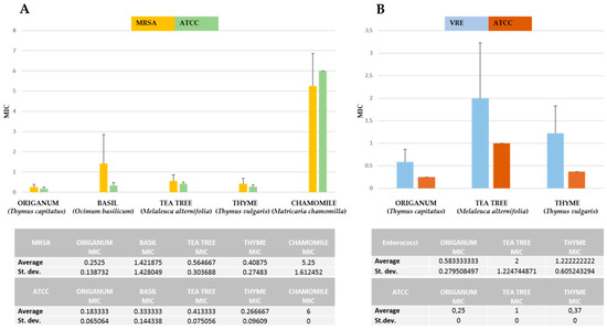 Comparison of MIC values of selected essential oils against wild and ATCC staphylococci (Α), wild and ATCC enterococci (Β).