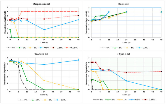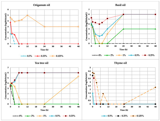 Time-kill kinetics were performed by exposing the tested microorganisms to the two-fold serial concentrations of each essential oil, ranging from 0.063% to 4% (v/v) and assessed by viable counts procedure [39]. At 0, 1, 3, 6, 8, 12, 24 and 48 h of the dilutions’ incubation, 10-μL amount of each tube was plated onto duplicate plates of MHA and after 24 h of incubation at 37 °C, plates were checked for visible bacterial growth. Experiments were performed in triplicate and viable counts (cfu/mL) plotted in logarithmic phase in relation to time.