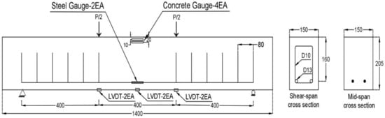 To obtain the vertical displacement under an increasing load, an LVDT was installed vertically on the bottom of the center section. In addition, the steel strain at each stage was measured using a steel strain gauge. To obtain the concrete strain at the compressive zone, the strain gauge of concrete was attached to the 10 mm, and 20 mm lines from the edge of the compressive zone.
