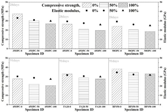 Meanwhile, the compressive strength and elastic modulus of the 45FA20 and 45BFS50 case specimens demonstrated better results than the 45OPC case at 91 days. The mineral admixture could be attributed to the pozzolanic reaction at a later ages.