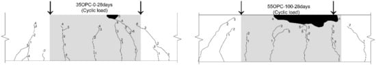 In general, the compressive strength of normal concrete (OPC) increases with age. Particularly, the influence of water content on concrete strength is obvious; however, sealed curing was executed for RC members in this study. Owing to the difference between previous research [20] and the cuing condition of this study, therefore, the increment in the compressive strength of the OPC case was little after 28 days curing period.