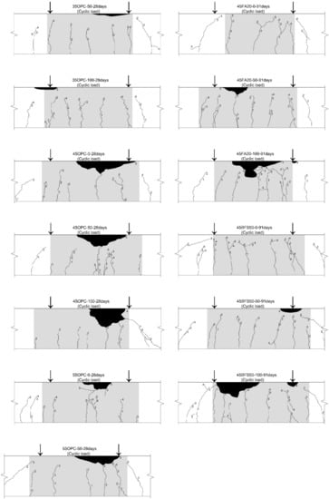 To evaluate the crack pattern, a crack map was drawn during the flexural test at different load levels. The Figure 4 shows a typical crack occurrence pattern in this test. From the results, all RC members began with the appearance of flexural cracks after the crack opening at the bottom of the center of the RC member, which grew vertically, regardless of the W/B ratios and substitution ratios. Furthermore, the initial flexural cracks were developed in the pure bending zone; as the load increased gradually, the shear-flexural crack appeared. The flexural cracks are extended in the vicinity of the pure bending zone and the failure of the RC members occurred owing to concrete crushing in the compression zone.