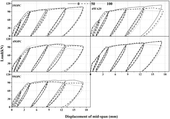 The initial cracking load could be specified at the end point of the linear relationship between the load and relative displacement of the RC members. Furthermore, the yielding load is determined from the reading values of the strain gauges placed on the reinforcing rebar at mid-span. The peak load is the maximum load of the load-displacement curve. As shown in Figure 5 and Table 7, the initial crack load was the largest for the 35OPC-0 case, and it was affected by the water-binder ratio and heavyweight waste substitution ratio.