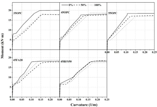 The bending moment of the initial cracking load corresponds to 3.6–6.8 kN·m in all RC members. The moment-curvatures exhibited a nonlinear relationship after curvature of the first cracking load. In the nonlinear region, the curvature of the all the RC members increased suddenly. Conclusively, the moment-curvature curves of the RC member were reduced significantly when all the fine aggregate were replaced by heavyweight waste glass.
