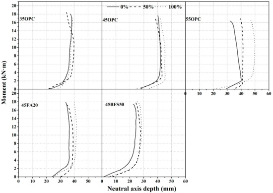 The experimental neutral axis depth of the RC member was obtained from the experimentally measured strain gauge values in the concrete and rebar. Figure 7 shows that the relationship between the moment and neutral axis depth determined until the rebar yielded. The results indicated that the neutral axis depth is immediately increased until 2–3 kN·m; subsequently, it converges to a constant value until the maximum moment is achieved. This trend is observed in all RC members, regardless of the water-binder ratio and heavyweight waste glass substitution ratio.