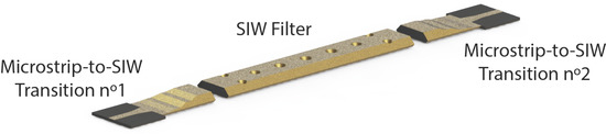 For the design of millimeter SIW filters, it must be mentioned that other materials can be used. To our knowledge, the solutions realized with RO5880 are state-of-the-art [7]. At the end of the paper, our results are compared with such solutions [7,8]. Due to their very good electrical properties at very high frequency, benzocyclobutene (BCB) and liquid crystal polymer (LCP) are also considered by some authors. In References [9,10], Ku-band SIW BCB filters with embedded silicon vias and K-band LCP SIW filters, respectively, are presented. However, despite interesting performances, these solutions use planar substrates with low thickness between 100 and 400 μm, leading to limited quality factors. Low Temperature Co-fired Ceramic (LTCC) is also a very convenient solution to minimize the footprint and to provide new freedom degrees in the design. Very interesting filters, designed at 60 GHz, are presented in Reference [11], but once again present limited quality factors, below 100.