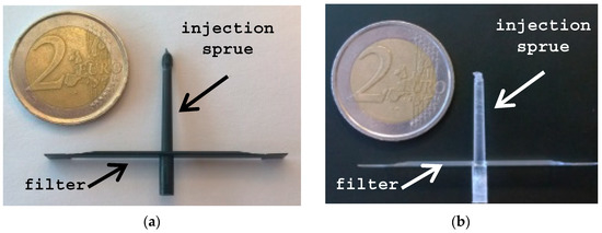 To illustrate the difference in appearance, Figure 2 shows pictures of the two filters after molding and before drilling. The black and the transparent filters are the loaded and the conventional, and are respectively presented in Figure 2a,b. Each picture is a side view of the filter, showing the vertical injection sprue which must be suppressed.