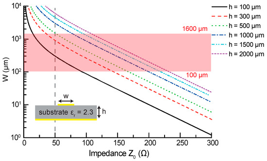 Impedance and width of microstrip line at 38 GHz for εr = 2.3 at different thicknesses of substrate.