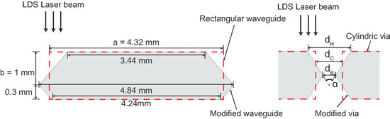 The principle is to activate the substrate locally, using a laser beam. The COP RS420-LDS used here, loaded with additional organometallic particles, permits the activation, and subsequently the electroless metal deposition, of the activated surfaces. The addition of the particles to the polymer modifies some of the characteristics of the material. It becomes fully black. In addition, the relative dielectric permittivity and the dielectric losses increase. One constraint of this technique is that it does not allow vertical walls to be activated. We thus had to rework the shape of walls and vias. We substituted cylindrical vias with hourglass shaped vias, which had an alpha angle of 70°.
