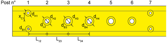 To better fit with standard MMIC dimensions, with which the filter could be interfaced in a system, we chose an access thickness of 300 μm. Moreover, the injection mold is in two parts, creating a surface joint, which has to be kept at the same height as the access line. To illustrate the overall changes, Figure 5 compares the modified filter with inclined walls (in grey) with the traditional rectangular SIW (in dotted red lines). Moreover, all the shape modifications were made, taking care to keep the same resonant modes and, obviously, the same electrical response. The diameters of the inductive posts depend on the electrical requirements and also the characteristics of the waveguide. One critical point here was the diameters of posts 1 and 7, at the extremities of the filter, which were too tiny to be drilled. To overcome this issue, one solution is to substitute each of these posts with a pair of posts, as shown in Figure 6.