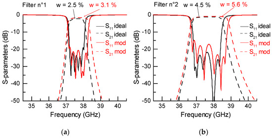 Electrical response of the two filters before and after modification with relative bandwidths of (a) 2.5% and (b) 4.5%.