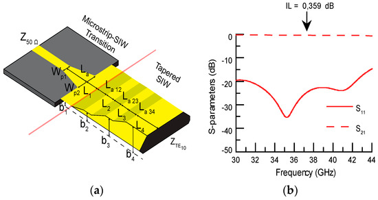 We broke down the transition into two parts. The first one, considering the same thickness of 300 μm, connects the microstrip line to a waveguide via a taper line [1]. The second part is a waveguide transition, inspired by Reference [13], on which several regular steps are made from the extremity of the last planar transition to reach a thickness of 1 mm. A good choice of shape of the transition is a key point to ensure correct modal transformation between microstrip TEM and TE10 SIW modes, and vice versa. However, a phase of optimization with an electromagnetic simulator was necessary to correctly adjust all the dimensions in order to obtain a sufficient bandwidth while minimizing insertion losses. The shape of the transition is displayed in Figure 8a, and the dimensions are given in Table 3. The electrical response of the transition, given in Figure 8b, shows a 20 dB relative bandwidth better than 30%, for a central level of insertion losses better than 0.4 dB. It is important to note that, once it is designed, the transition is transparent whatever the filter chosen. This means that the assembly of the whole structure, one filter and two transitions, does not require any modifications.