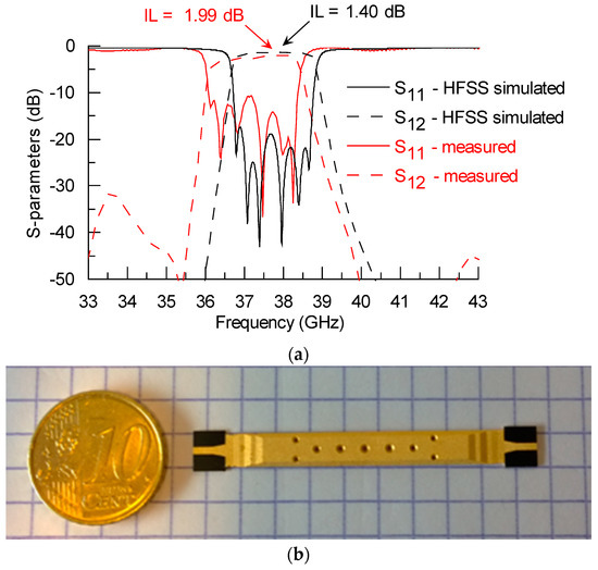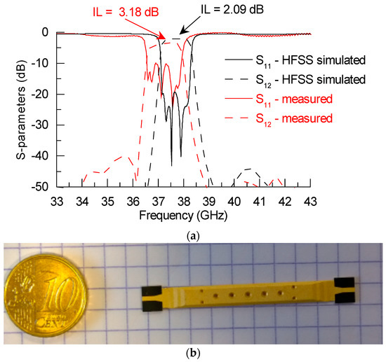 Measurements were made on the filters using a VNA E8364a (0–50 GHz) from Agilent® and a universal test fixture 3680 V from Anritsu®. The electrical responses of the two filters are shown in Figure 9a and Figure 10a, where the experimental data are compared with simulations. Despite differences observed between simulated and measured responses, the results validate the approach taken, as in each case an electrical response was obtained with all of the six poles in the bandwidth. Several differences can be observed in the experimental responses. First, there is a slight shift of the central frequency by about 1% that can be attributed to technological dispersions on the dimensions of the plastic piece, to the mechanical drillings, and at the first order to the uncertainty of the relative dielectric permittivity value of the thermoplastic. Second, the transmission levels in the attenuated bands are higher, due to the fact that parasitic couplings between the access microstrip lines of the filter are accentuated by the test fixture. It should be remembered that the filters are very short in length, less than 5 cm, thus promoting such couplings. Third, the matching levels are a few decibels higher than expected, hence impacting the level of insertion losses. This can be explained by the lower electrical conductivity of the LDS metallization, composed of copper but also of a thin layer of nickel/phosphorus, in comparison with a typical PCB copper layer. It also can be explained by the non-uniform roughness and the presence of some discrepancies in the dimensions: thickness of the microstrip access part, width of the microstrip lines, and positioning of the inductive posts.