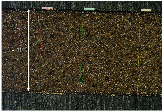 One important advantage of the LDS technique is that it makes it possible to obtain thick and robust metallization by chemical electroless deposition. The downside is the high degree of surface roughness, due to the action of the laser beam during activation [16,17]. Metal was deposited using commercial electroless solutions of copper, nickel, then gold. Deposition was examined with a stylus profilometer, showing surface roughness (Ra) equal to 5 μm and root mean square roughness (Rq) of 6.2 μm. To illustrate this roughness, Figure 11 presents the profile of one of the microstrip lines of a filter under an optical microscope.