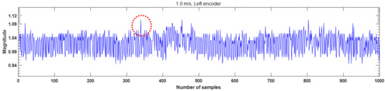 An example of anomalies observed from a left encoder sensor while driving. The red circle indicates one of anomalies which occur during the normal operation (just driving) on the real road, and disappear soon without any damage to the Jackal behavior.