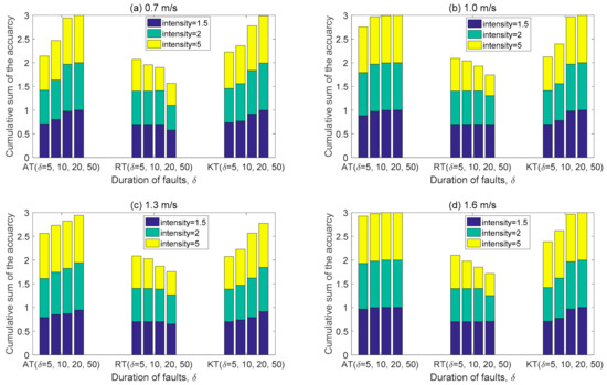 Accuracy according to each intensity as a function of constant fault duration: (a) Cumulative sum of the accuracy at 0.7 m/s of Jackal unmanned ground vehicle (UGV); (b) Cumulative sum of the accuracy at 1.0 m/s; (c) Cumulative sum of the accuracy at 1.3 m/s; (d) Cumulative sum of the accuracy at 1.6 m/s.